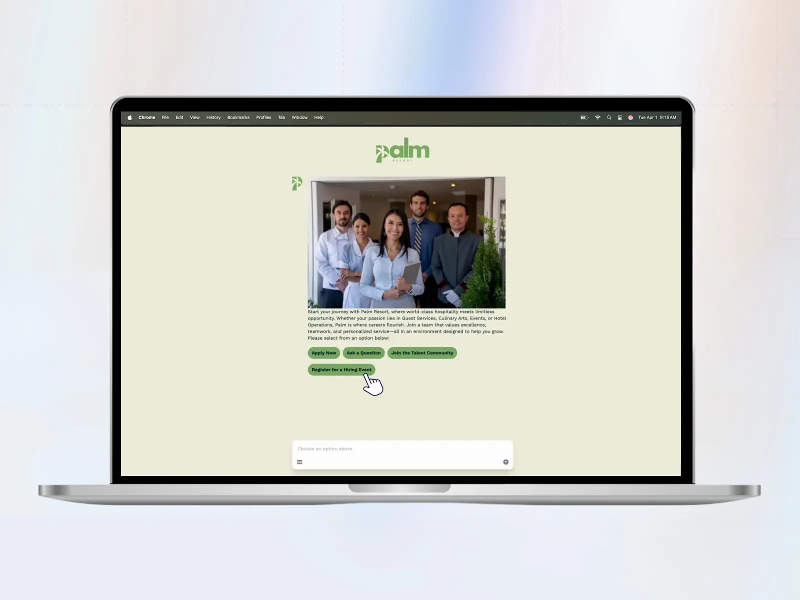 Candidates can register, apply to jobs, or join your talent community through a single, seamless chat experience. That means fewer drop-offs and more high-intent talent ready to move forward.